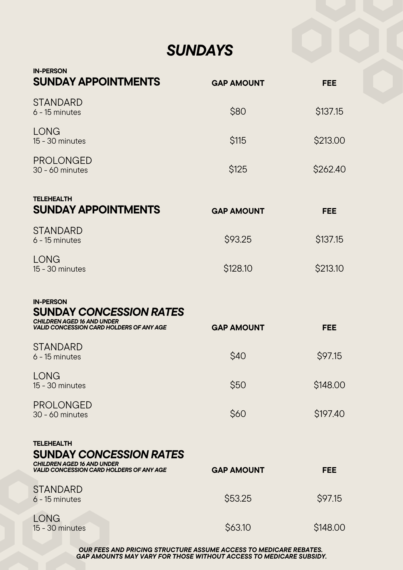 All patients aged 16 and under, and patients of any age who hold a valid Health Care Card, or Pension Card, will automatically be billed at our reduced gap fee rates. If you don’t meet the criteria for our concession fees, or if you find that the out-of-pocket costs are prohibitive, we encourage you to please discuss this with your doctor.