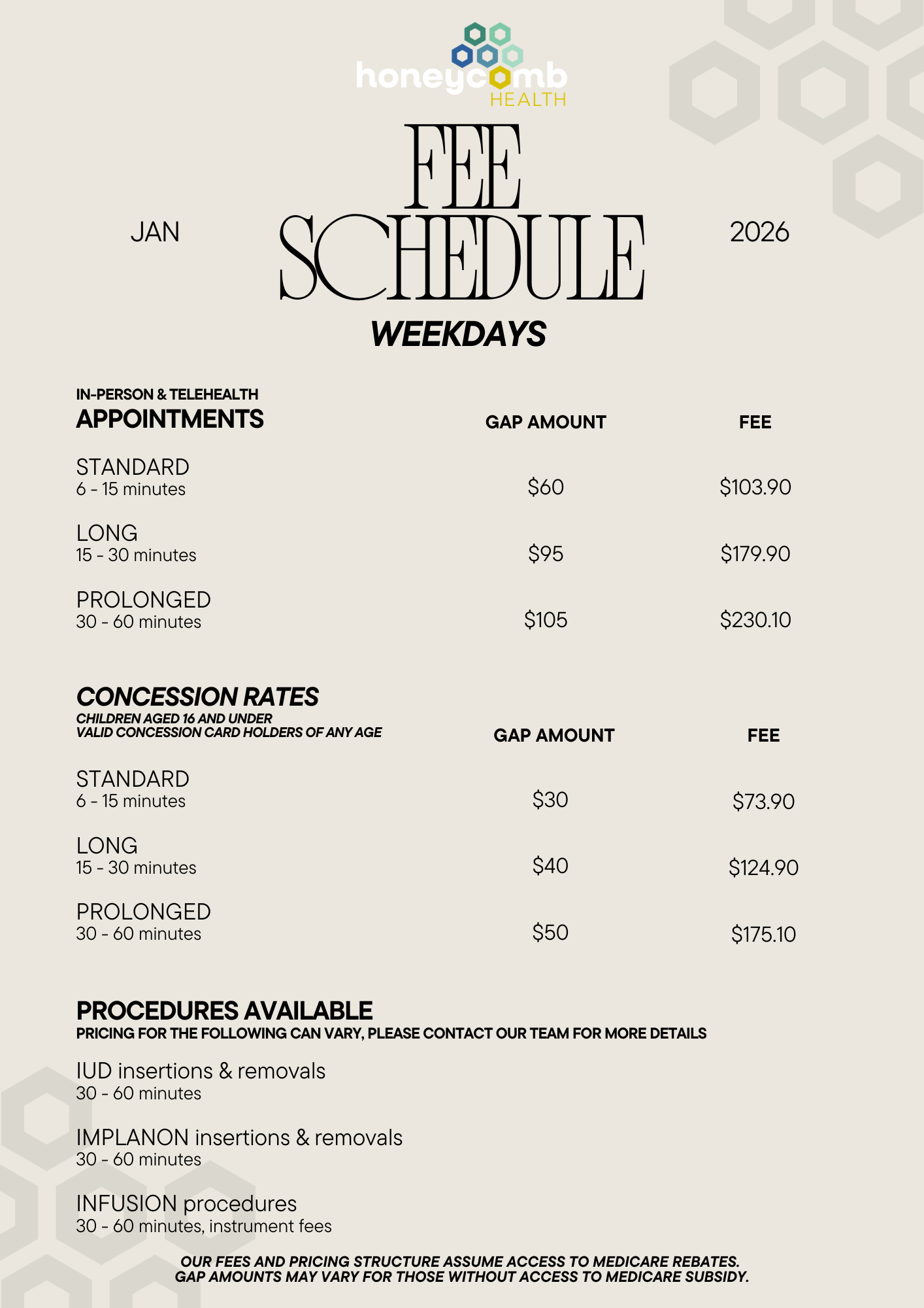 Honeycomb Health is a private billing practice. We offer a range of consultation types according to your healthcare needs. Appointments with allied health professionals within our network remain subject to their own separate fees and policies.
